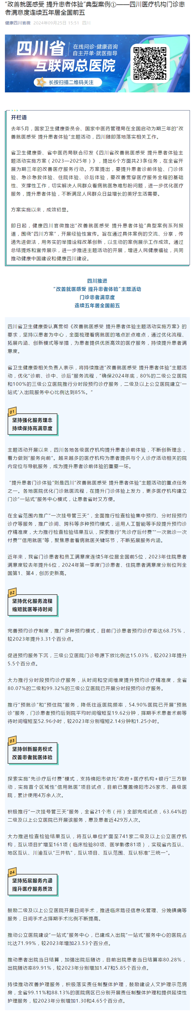 “改善就医感受 提升患者体验”典型案例①——四川医疗机构门诊患者满意度连续五年居全国前五