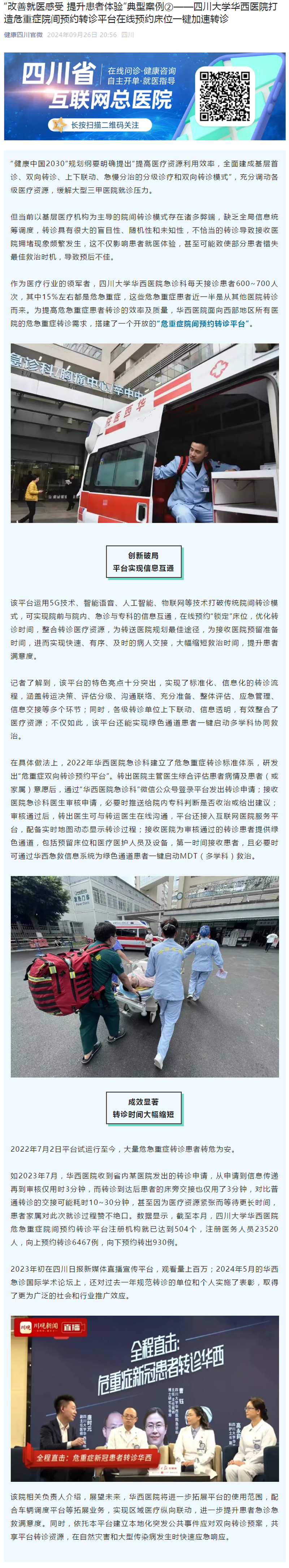 “改善就医感受 提升患者体验”典型案例②——四川大学华西医院打造危重症院间预约转诊平台在线预约床位一键加速转诊