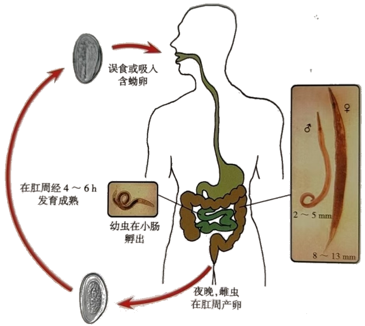 逆行感染:肛门周围孵化的幼虫可能再钻入肛门到达肠内发育为成虫,引起逆行感染。