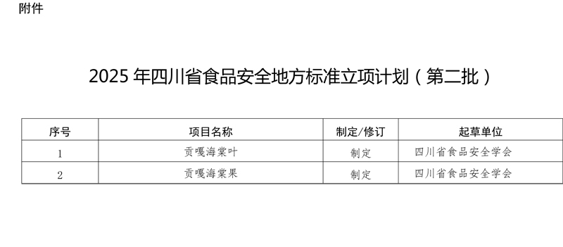 根据《中华人民共和国食品安全法》及其实施条例、《四川省食品安全地方标准管理办法》的有关规定,我委在公开征集食品安全地方标准立项建议的基础上,经省食品安全标准委员会秘书处初审并组织专家评审论证,拟制了《2025年四川省食品安全地方标准立项计划(第二批)》。
