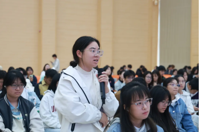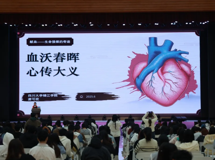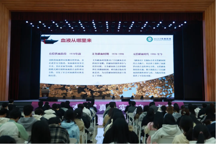 随后,四川大学华西医院输血科主任谭斌带来 “生命无界,传递大爱” 无偿献血主题宣讲。谭斌以临床真实案例切入,打破 “献血伤身体” 的误区,让大家了解到健康成年人定期献血不仅不会影响健康,还能促进血液新陈代谢;同时,详细介绍了血液从采集、检测到临床使用的全流程。同学们反响热烈,互动频频。