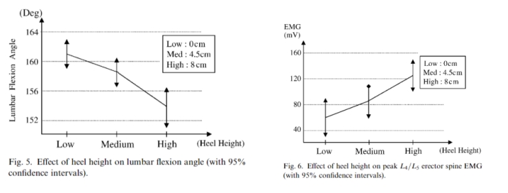 图展示随着鞋跟高度增加腰椎屈曲角度减少,竖脊肌发力增加。