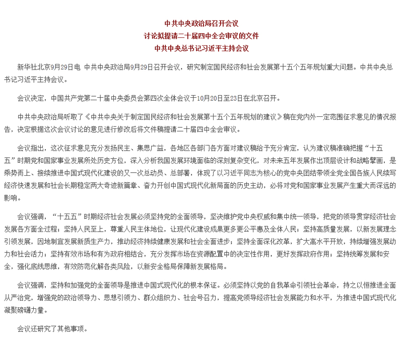 中共中央政治局召开会议 讨论拟提请二十届四中全会审议的文件