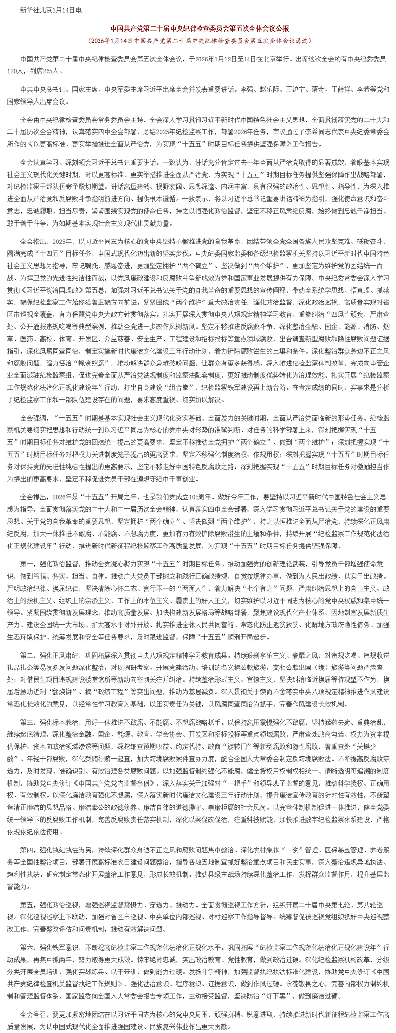中国共产党第二十届中央纪律检查委员会第五次全体会议公报