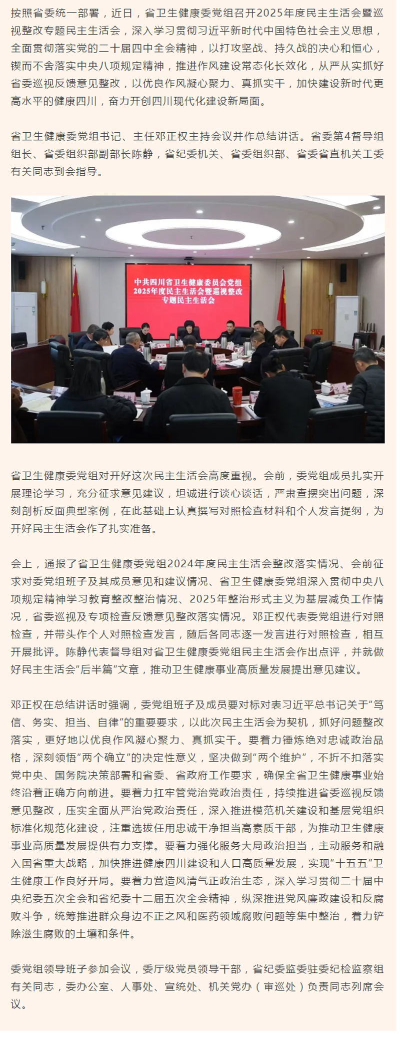 省卫生健康委党组召开2025年度民主生活会暨巡视整改专题民主生活会