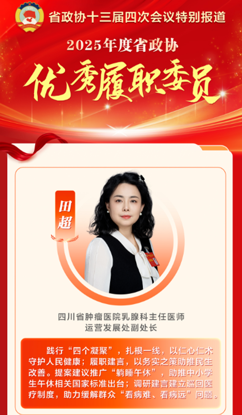 其中,四川省肿瘤医院运营发展处副处长、主任医师、省政协委员田超荣获2025年度省政协优秀履职委员称号。